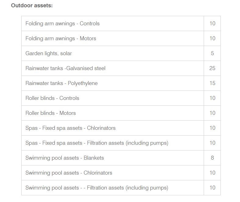 - Swimming pool assets, chlorinators, filtration including pumps 10 years each
